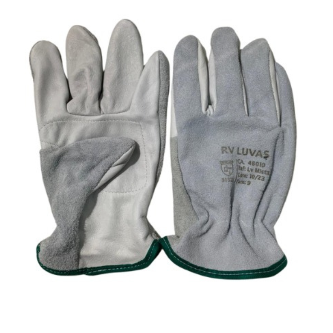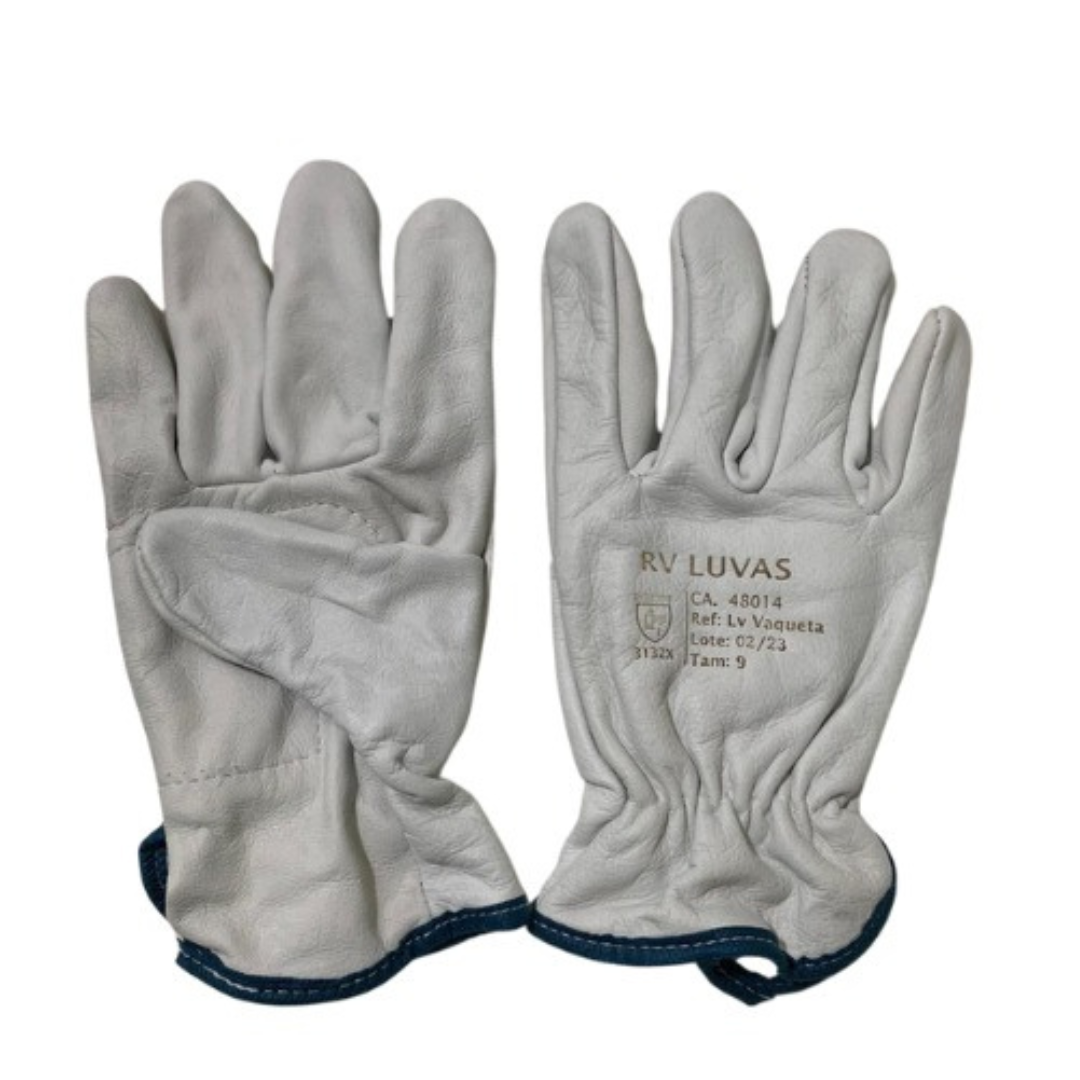 Luva de segurança confeccionada em vaqueta na palma, raspa no dorso, com reforço interno na palma, elástico no dorso, viés de acabamento.